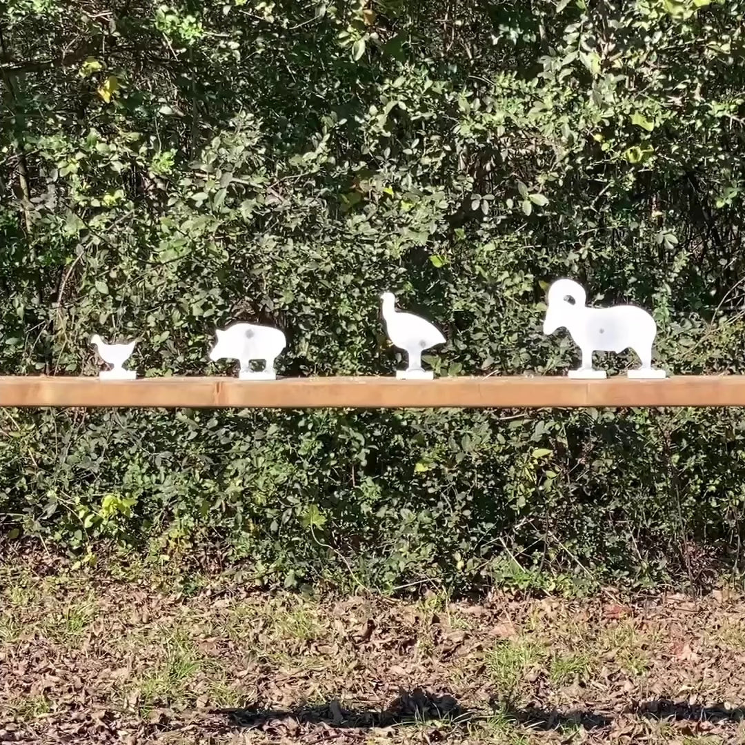 Set includes 1 Chicken (2 ½” x 2 ¼”), 1 Turkey (4” x 4 ½”), 1 Pig (4 ½”x3”) and 1 Ram (6 ½” x 5¼”) all welded on 1"x2" Bases.